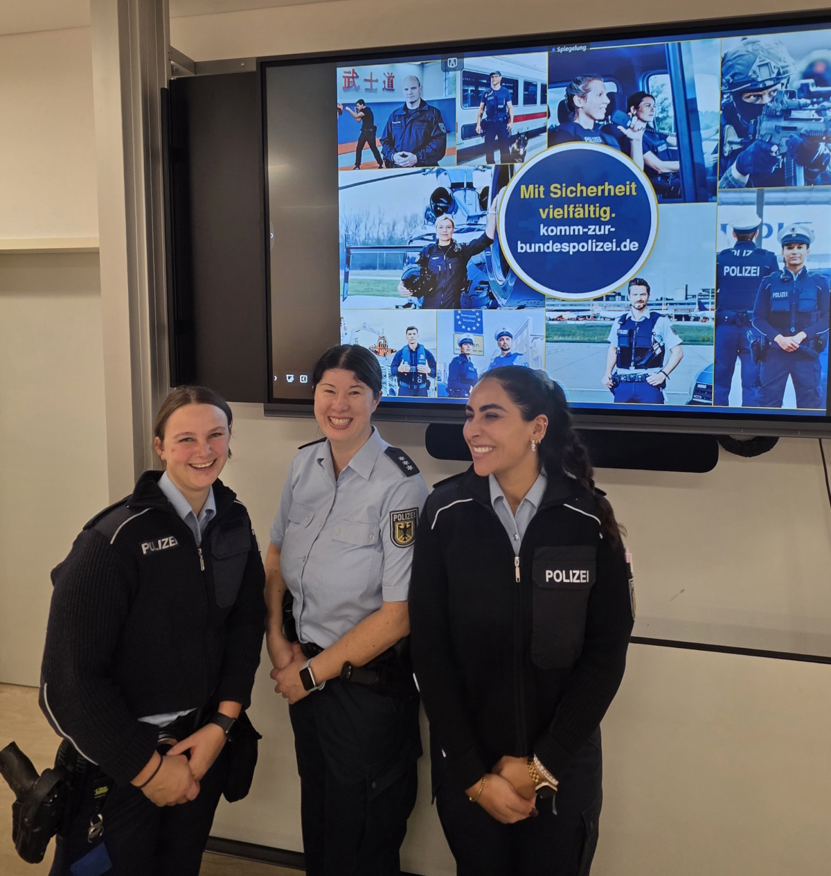 Die Bundespolizistinnen Darin Erb und Angelique Felix von der Bundespolizeidirektion des Frankfurter Flughafens sowie Stefanie Ullmann von der Bundespolizeiakademie informierten über Ausbildungsmöglichkeiten nach dem Haupt- und Realschulabschluss sowie duale Studiengänge nach der Fachhochschulreife bzw. nach dem Abitur.