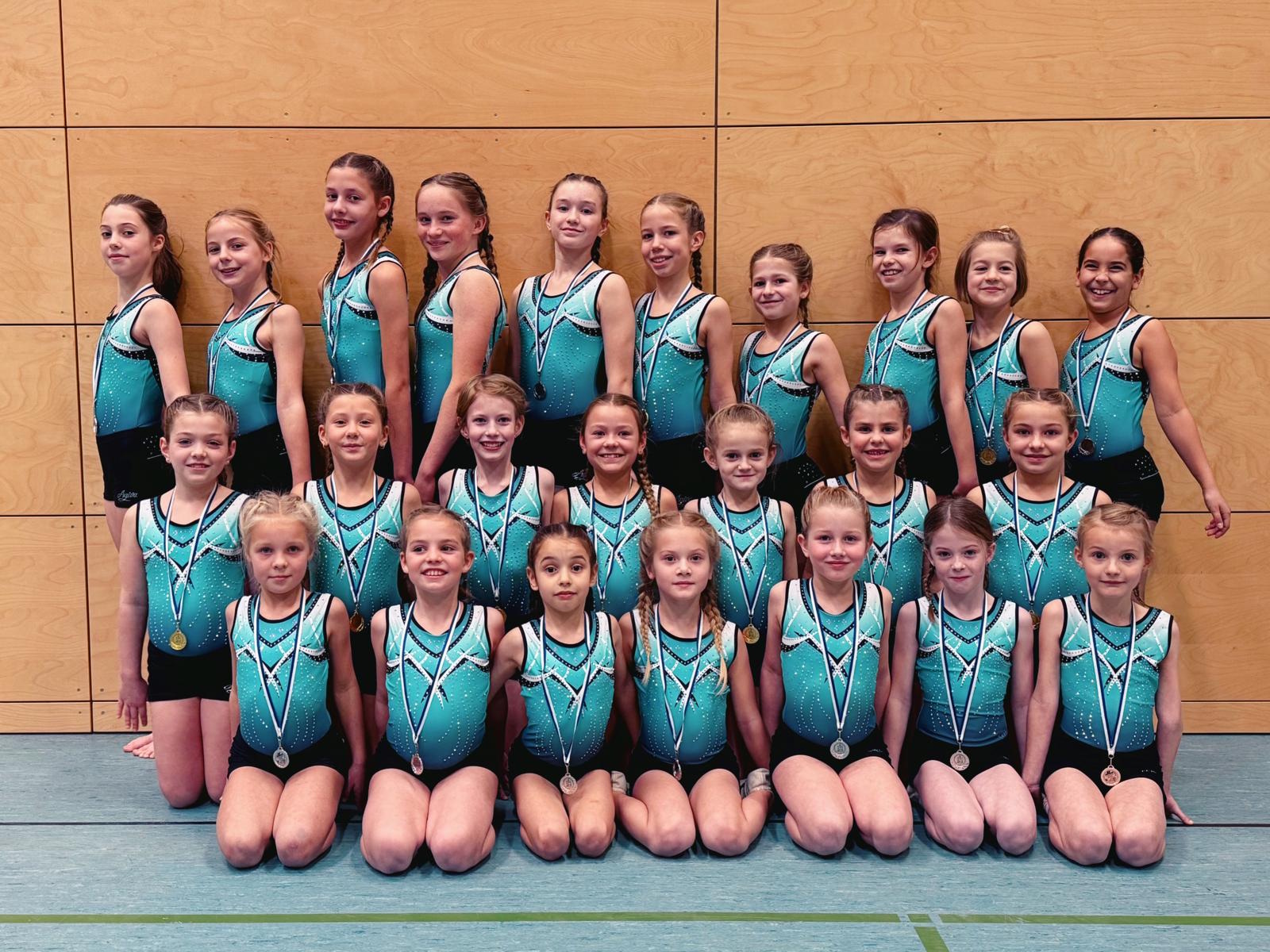 Im Wettkampf Jahrgang 2015 und jünger ging die Mannschaft mit Lilly Heinkel, Sina Becker, Emma Neis, Theresa Schirmer, Emma Schaffer, Johanna Schramm, Enissa Dizer an den Start. Sie sicherten sich mit 13 Punkten Vorsprung den ersten Platz. Mehrere Turnerinnen zeigten ihre ersten Überschläge über den Tisch und viele Salti am Boden. Die stärksten Geräte dieser Mannschaft waren Boden und Trampolin. Sie haben drei weitere Mannschaften geschlagen.