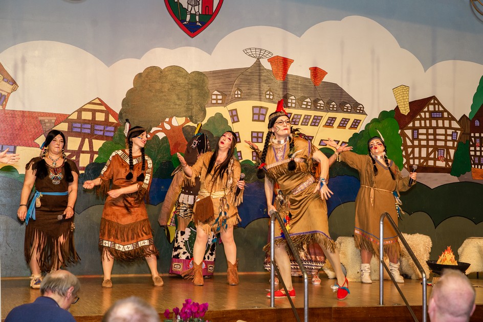 Es folgte ein weiterer kurzer Ausblick auf die kommenden Sitzungen. Die „Mispelchen“ sind zurück auf der Bühne und getreu dem Motto trafen sich die weltoffenen süßen Maronen vom Stamme der Schoschonen mit ihrem Häuptling Schwarzer Adler zum „Tratsch am Lagerfeuer“, wo jede der jungen Maronen von ihren Sorgen und Nöten mit den Erfindungen der neuen Welt berichtete. Ob nun die digitale Suche nach dem perfekten Partner, dem Thermomix, der dann doch kein Büffelgulasch schneiden kann oder den Herausforderungen, die ein wilder Ponyritt durch die Prärie für das Haar einer Squaw darstellt. Alles wurde durch einen eigenwilligen Totempfahl und sein Orakel kommentiert und sorgte für zahlreiche Lacher im Publikum.