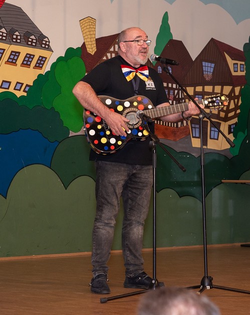 Zum Abschluss des kurzen aber knackigen Programms gab es dann noch einen Überraschungsgast – Harry Borgner stand vor der Tür und die Narren ließen ihn nur zu gerne auf die Bühne. Dort präsentierte der „Mann der 1.000 Stimmen“ sein neues Programm, in dem er bewies, dass es auch ohne die allgegenwärtige KI möglich ist Stimmen zu parodieren. Und so lachten die Narren Tränen als Borgner den ursprünglich von den Comedian Harmonists 1934 veröffentlichen Song „Mein kleiner grüner Kaktus“ in Versionen von Herbert Grönemeyer, Howard Carpendale, Heintje, Reinhard Mey bis hin zu Udo Lindenberg parodierte.
