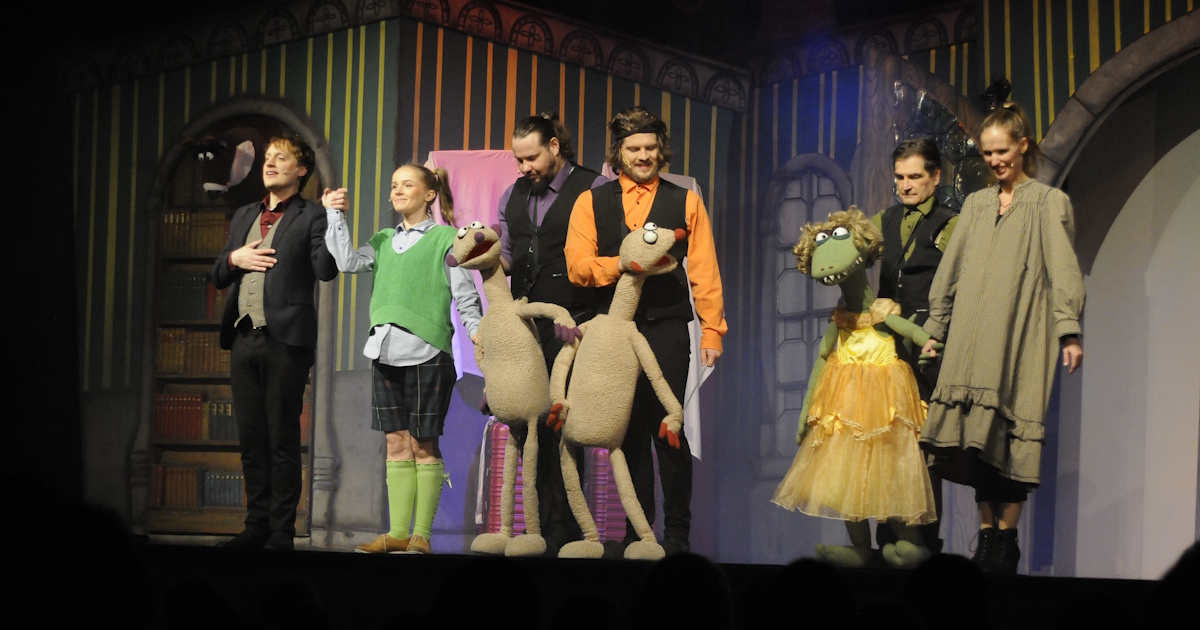 Es braucht nur ein paar wenige tapsige Tanzschritte der beiden Erdmännchen-Zwillinge, die den kleinen Menschen im Publikum aus dem Kinderkanal vertraut sind, und schon ist vergessen, dass Jan und Henry Puppen sind und von ihren menschlichen Assistenten Christian Steinborn als Jan und Maximilian Nicola Wenning als Henry Unterstützung brauchen. Oder genauer: Die Hinterpfoten der in der Realität maximal 35 Zentimeter großen Raubtiere sind mit den Füßen der beiden Schauspieler verbunden, eine Hand führt einen Arm der possierlich wirkenden Puppen, die andere macht den Kopf beweglich. Das Ergebnis: Zwei (nahezu) echt wirkende Puppen von knapp eineinhalb Metern Größe, die als eigenständige Wesen wahrgenommen werden.