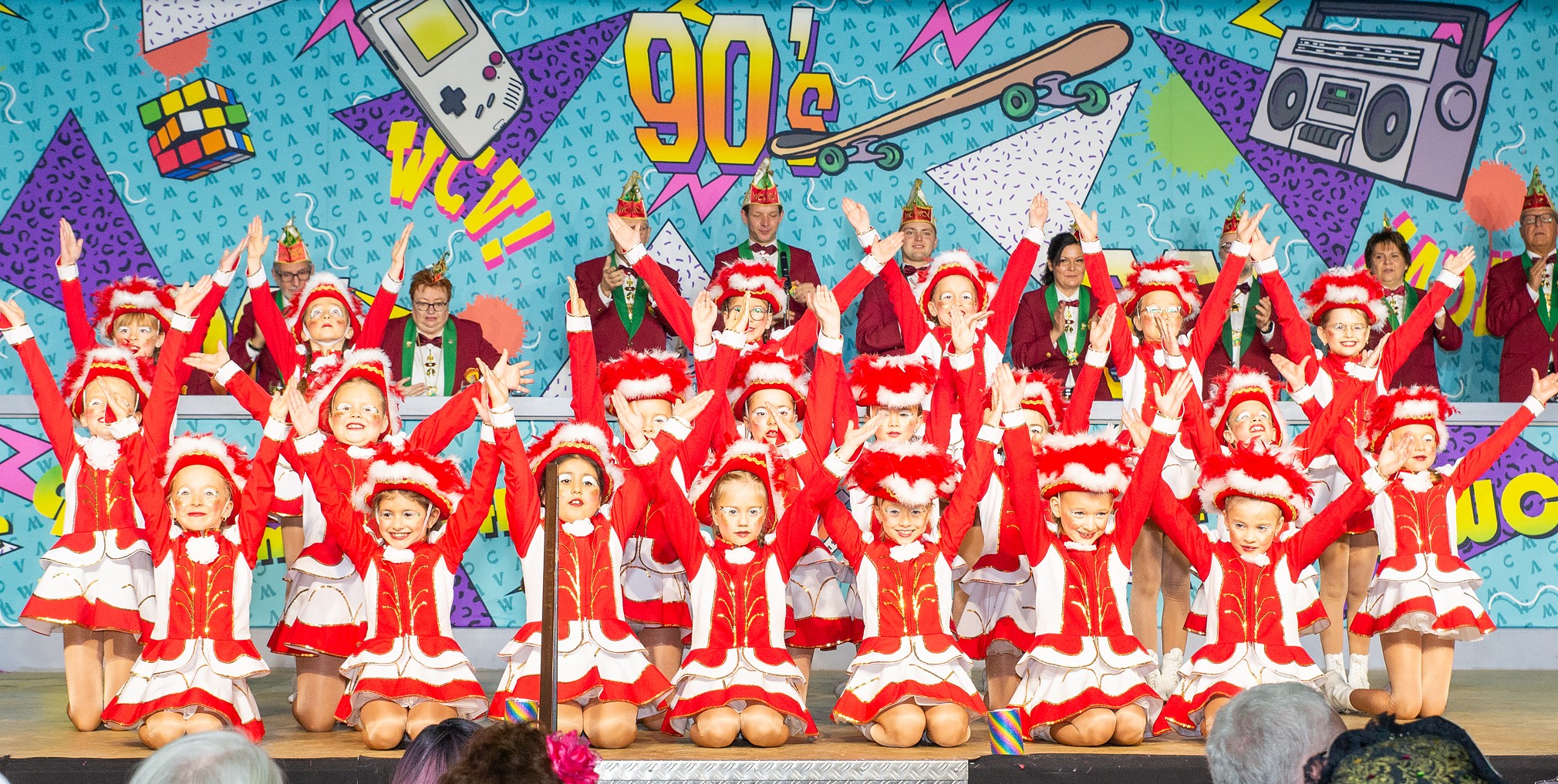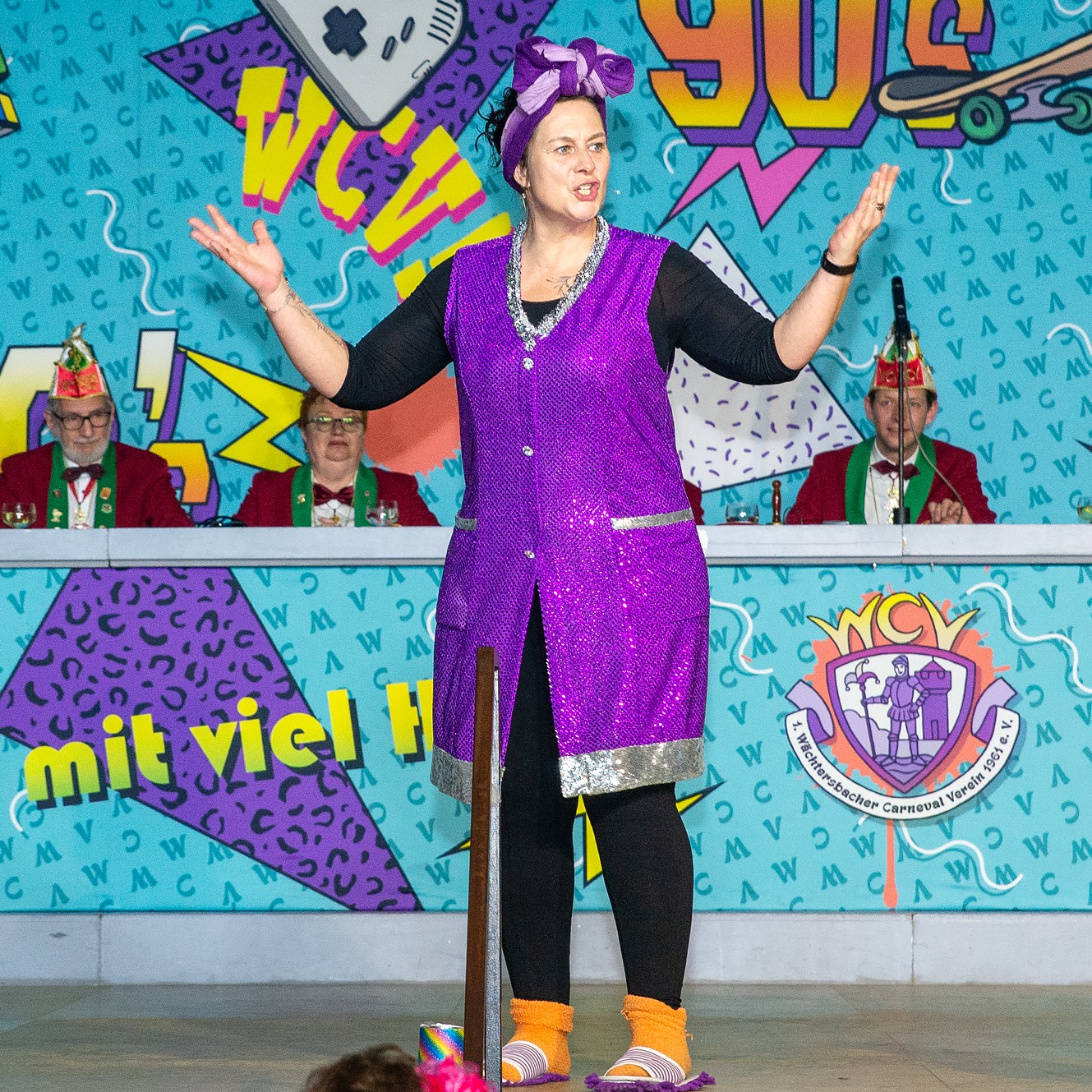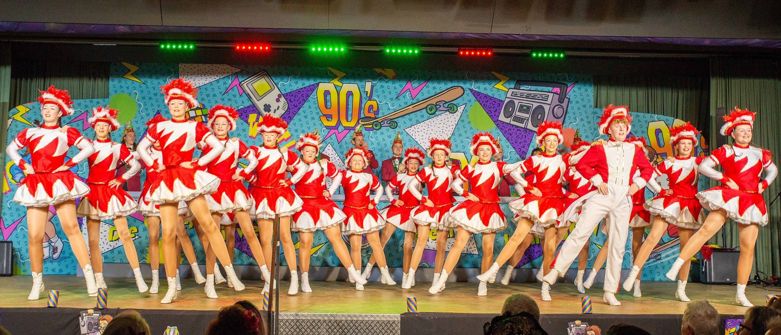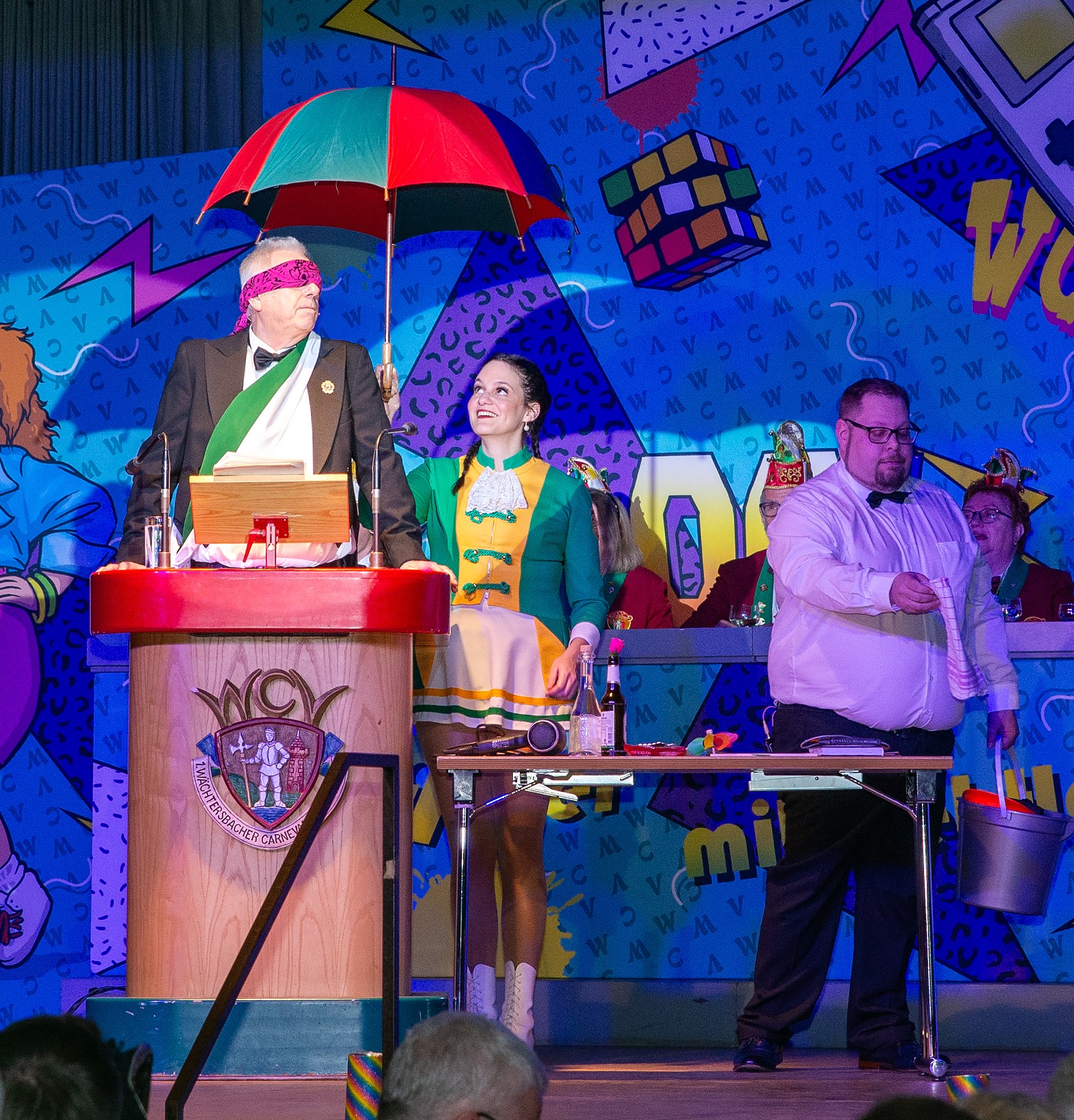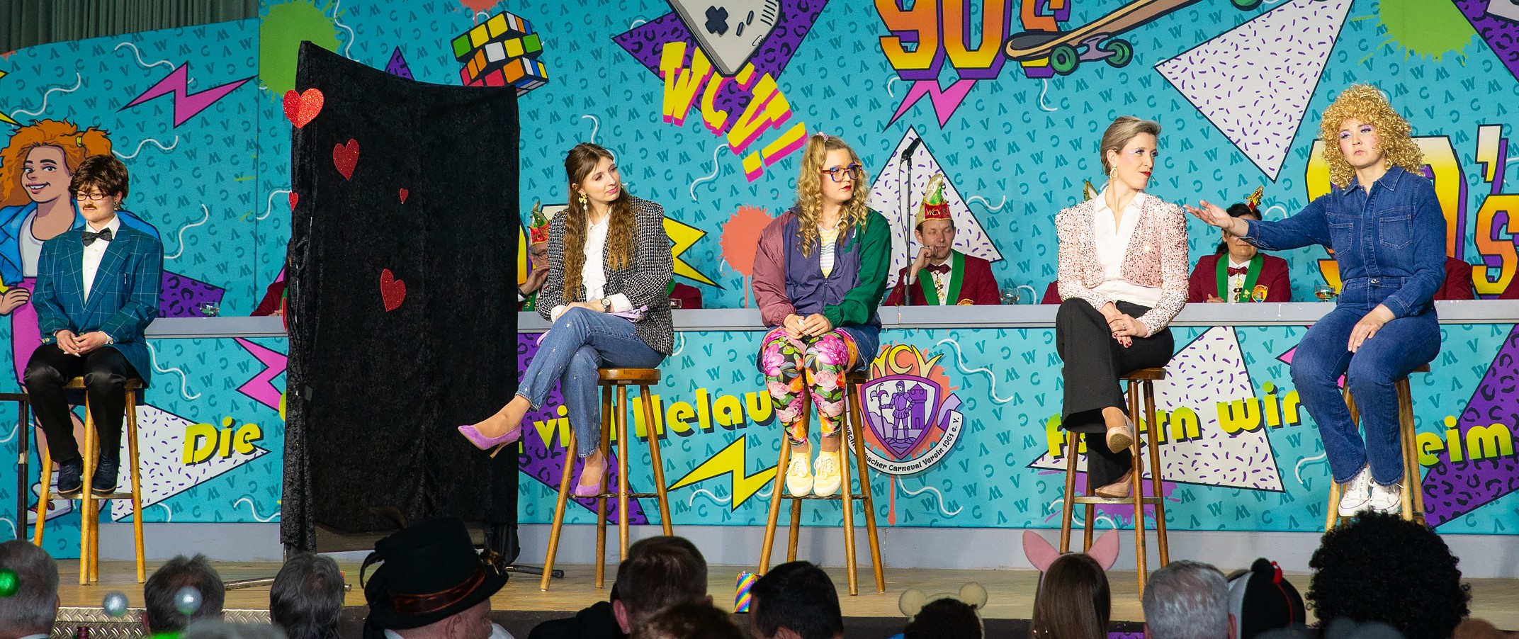 Die Juniorgarde sorgte mit ihrem neuen Gardetanz zu 90er Jahre Rhythmen für tosenden Applaus. Die Schunkelrunde wurde dann dazu genutzt, um die Bühne für die WCV-Sketchgruppe „Die Süßgespritzten“ vorzubereiten.