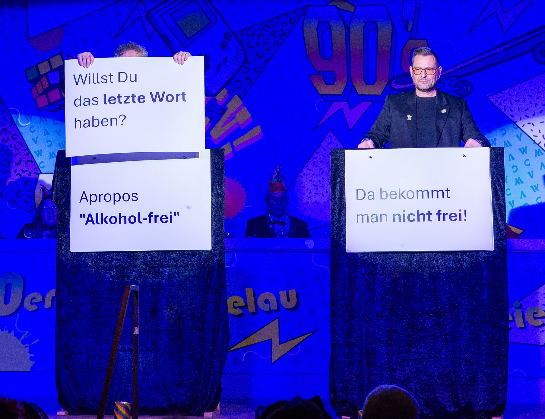 Dann ging es auch schon weiter mit einem alten Bekannten aus der Mainzer Fastnacht. Harry Borgner - der „Mann der 1.000 Stimmen“ bewies, dass es auch ohne die allgegenwärtige KI möglich ist, Stimmen zu parodieren. Und so lachten die Narren Tränen als Borgner den „Holzmichel“ in Versionen von Karel Gott, Udo Jürgens, Reinhard Mey bis hin zu Udo Lindenberg parodierte.