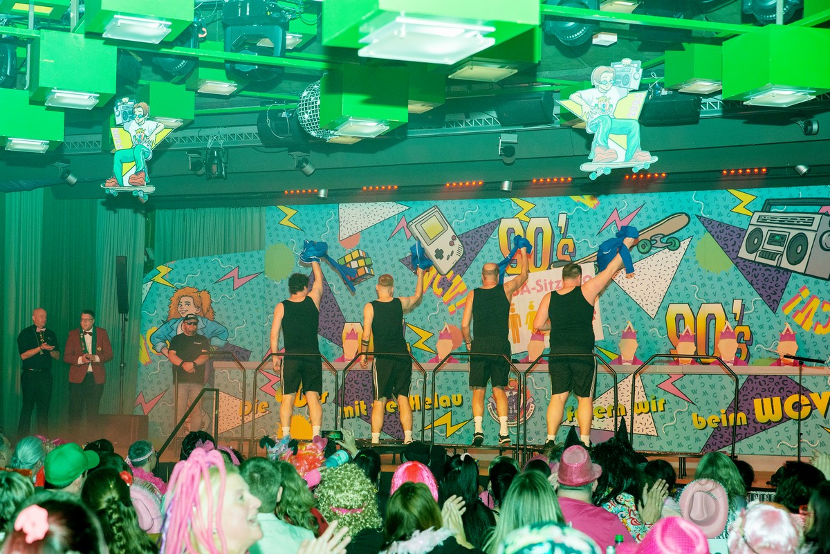 Die Männertanzgarde „Happy Hüppos“ eröffnete auf der WCV-Bühne ihren Hüppo Counter und unterbreitete in einem fantastischen und amüsanten Tanz ein Fastnachtsangebot der ganz besonderen Art – inklusive Leergutrückgabe.