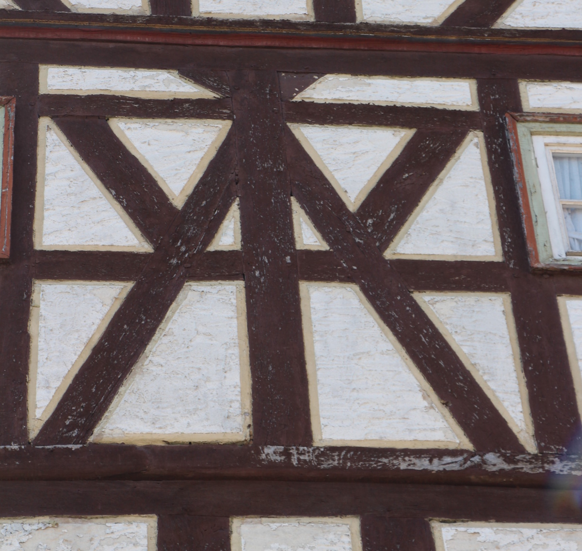 Fachwerkhäuser gebe es in Deutschland ungefähr seit 1250. In Amorbach gebe es etwa das Templerhaus von 1291. Dann geht es auch schon mit Gelnhausen los: Hier sind zum Beispiel das gotische Haus in der Kuhgasse und das alte Brauhaus am Romanischen Haus zu nennen. Sie stammen aus der Zeit um 1350. Wächtersbach hingegen blühte in der Renaissance erstmals auf, nicht nur mit dem Ausbau des Schlosses und dem Bau des Kirchturms. Hier sind das alte Rathaus von 1495 zu nennen, ca. 50 Jahre jünger ist der Rumpenheimer Hof. Seit dem Mittelalter sei Zierfachwerk verwendet worden, zum einen zur Repräsentation, zum anderen zur Dämonenabwehr. Symbole, die Unheil abwenden sollen wie etwa das Andreaskreuz seien in die Fassade eingebaut worden. Daraus wurden ab etwa 1530 die allgegenwärtigen „Feuerböcke“, also geschwungene, häufig verzierte Andreaskreuze. Andreaskreuze sind uralte heidnisch-christliche Symbole zur Abwehr von Unheil. In Gelnhausen und Wächtersbach findet sich jeweils ein Beispiel, wo man mit Andreaskreuzen Schlafzimmer markiert hat – zur Sicherheit für den Brandfall.