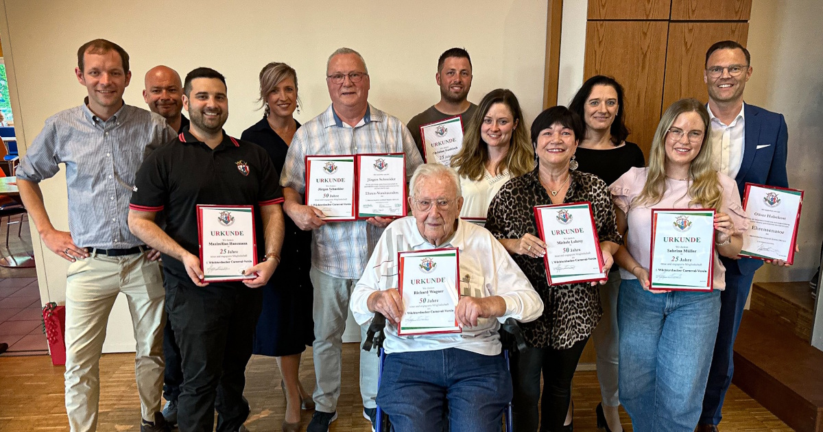 In diesem Jahr wurden wieder zahlreiche Ehrungen vorgenommen und so erhielten für 25 Jahre treue Mitgliedschaft folgende Mitglieder die Vereinsnadel in Silber: Maximilian Hansmann, Melissa Kleespies, Christian Knobloch, Sabrina Müller, Luisa Schaub sowie Bruno, Heike und Martin Wiesner. Die Verdienstnadel in Gold für 50 Jahre treue Mitgliedschaft erhielten Marita Deubert, Karin Hofferbert, Michele Lohrey, Richard Wagner und Jürgen Schneider.