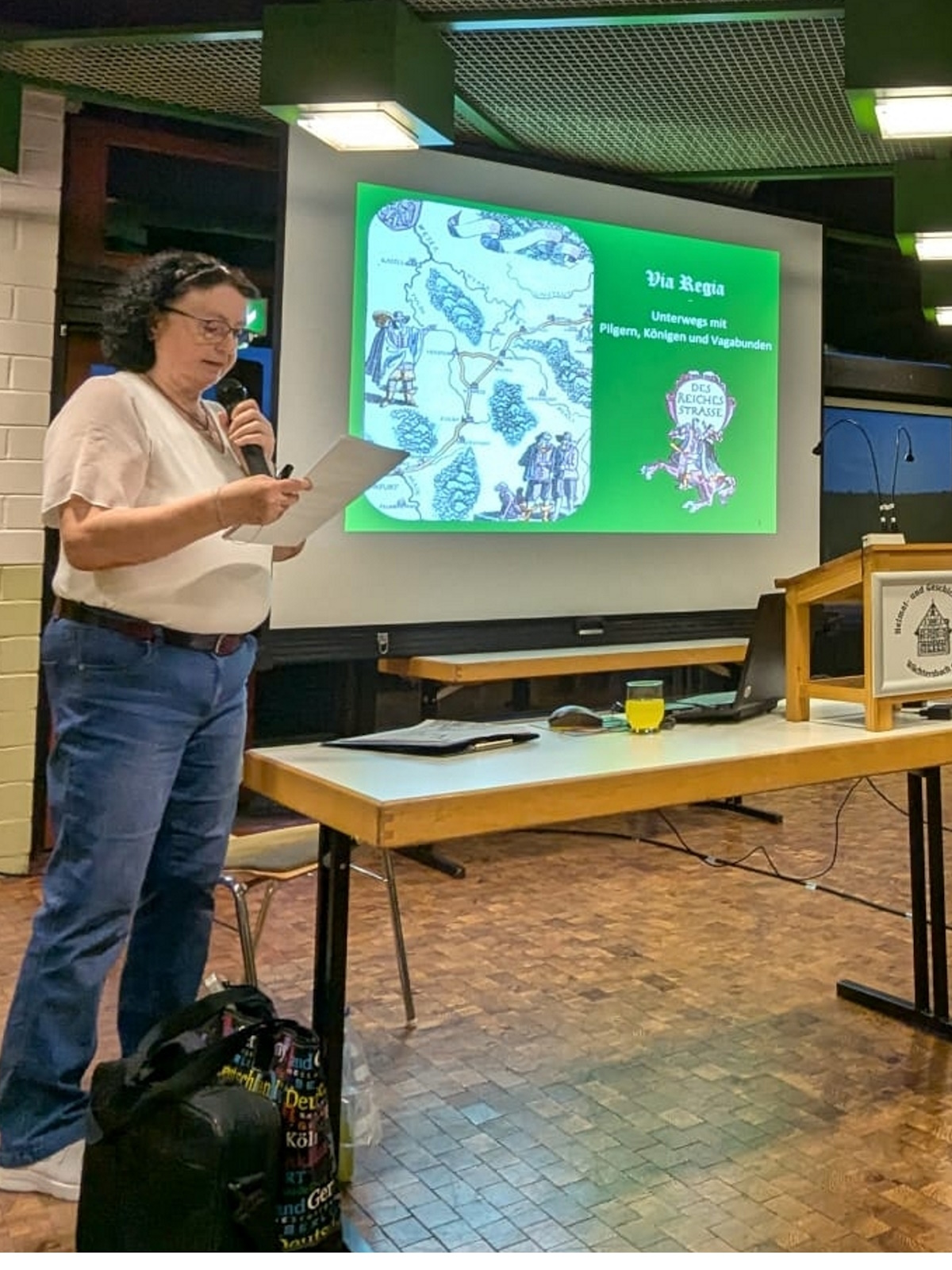 Der Vortrag von Gudrun und Reinhard Kauck widmete sich der Via Regia, in der Region sicher besser bekannt als Frankfurt-Leipziger-Straße oder auch alte Heerstraße. Die Via Regia führt 4.500 Kilometer von Santiago de Compostella nach Kiew. Die Referentin Gudrun Kauck nahm die Besucher mit auf ein ca. 85 Kilometer langes Teilstück der Via Regia von Hanau bis Fulda. Bedingt durch die Kleinstaaterei mussten dabei 11 Zollschranken passiert werden und außerdem Brückengeld, Pflastergeld und Chausseegeld bezahlt werden - und das für Straßen, die teilweise diese Bezeichnung nicht verdienten.